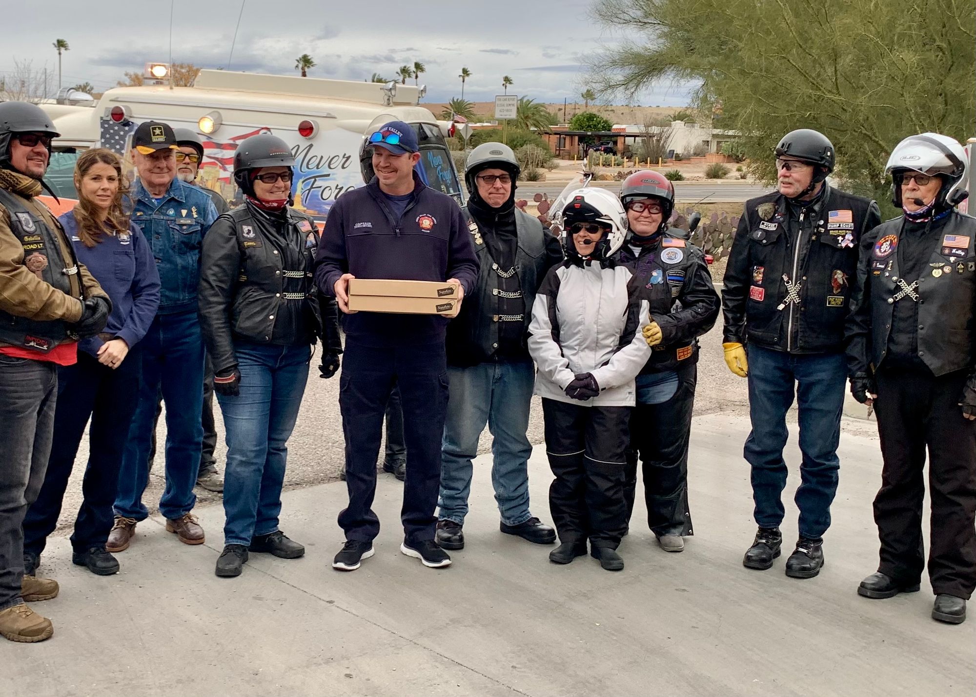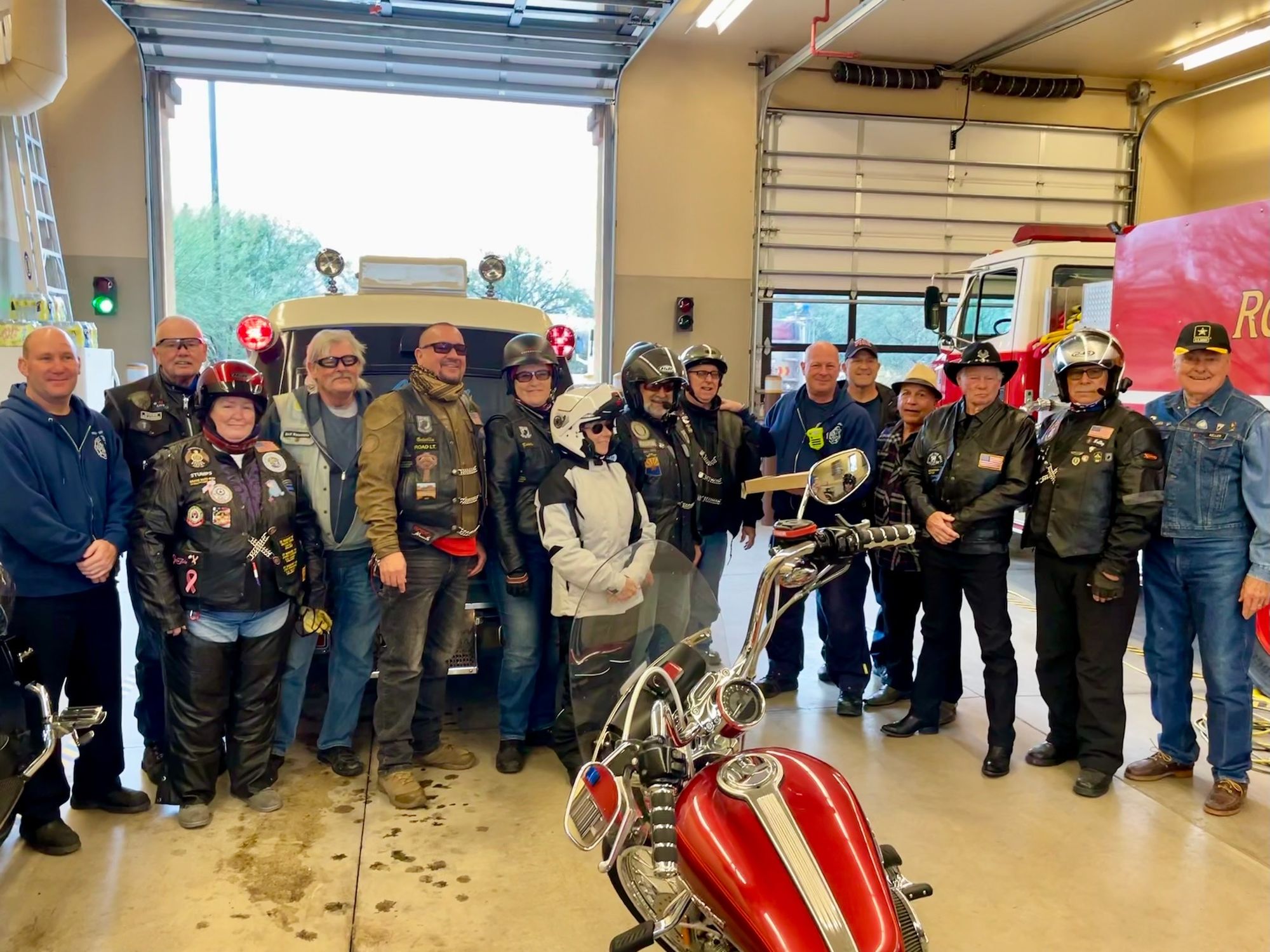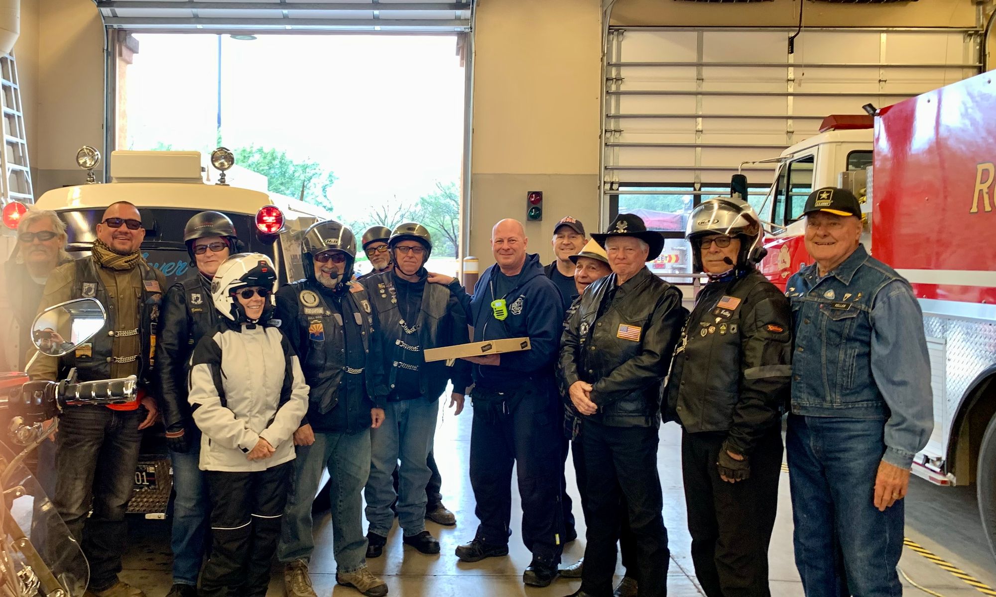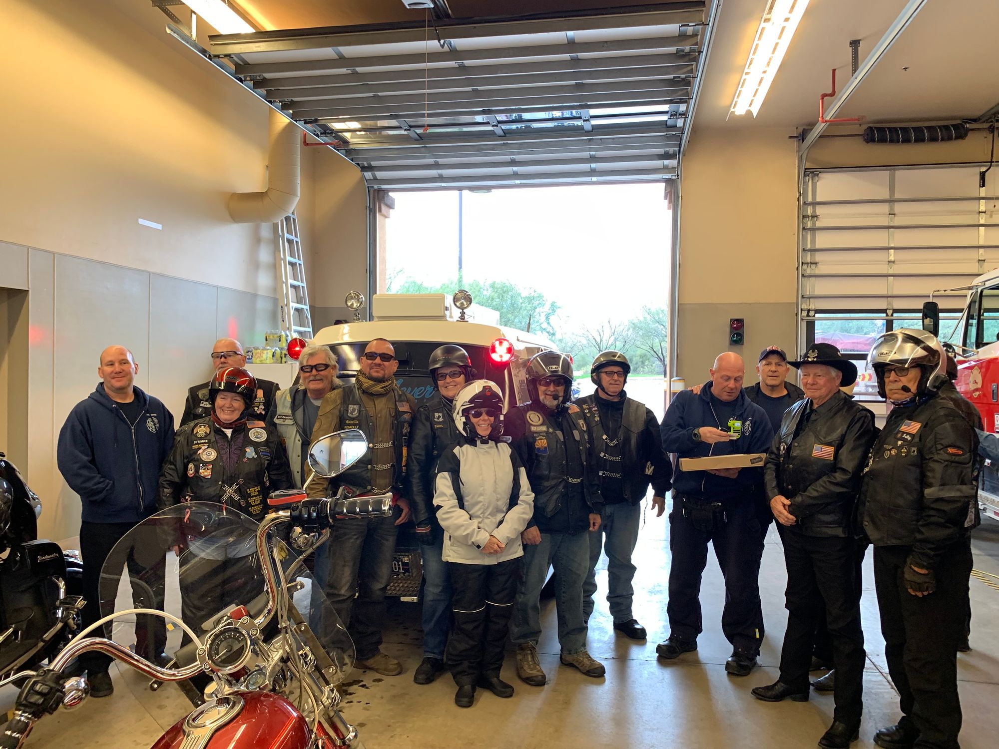 With a great heaping supply of God's Blessings, an Emergency Call for the Fire Crews at Station #'s 152 & 153 (our first two visits) the doughnut Delivery and 'visits' were QUICK. That extra time had us sipping hot conncoctions at the "Thaw" after party before the Rain hit the ground. We did miss a few of our BNR Riders at the Thaw though, they 'beat feet' home to STAY dry.
